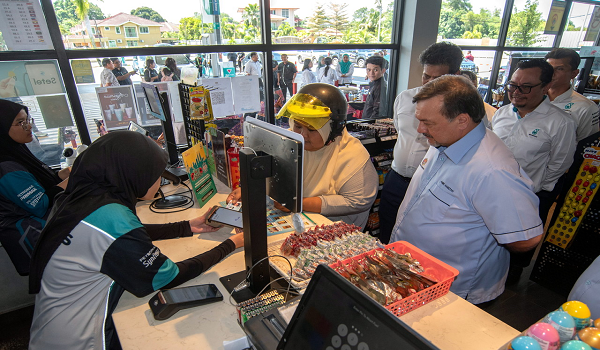 Menteri Kewangan II Datuk Seri Amir Hamzah Azizan (depan,kanan) membuat tinjauan penerima Sumbangan Tunai Rahmah (STR) yang membuat pembayaran pengisian minyak menggunakan inisiatif BUDI MADANI RON95 (BUDI95) ketika lawatan di Stesen Petronas Durian Tunjong hari ini. Foto- BERNAMA